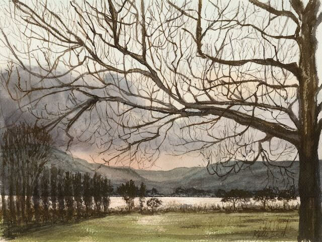 Kaipara Harbour North of Auckland, Northland, New Zealand. Watercolour landscape stormy skies, sea and land. Contemporary